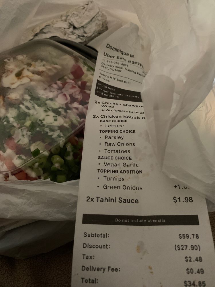 Tomatoes, lettuce, pickled turnips, green pickles, parsley, garlic sauce, garlic, tahini sauce