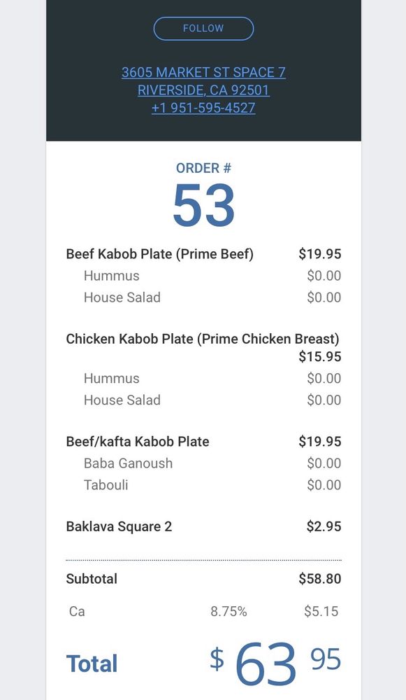 Any combination of beef, chicken or kafta kabobs. Side portions are smaller than the appetizers.
